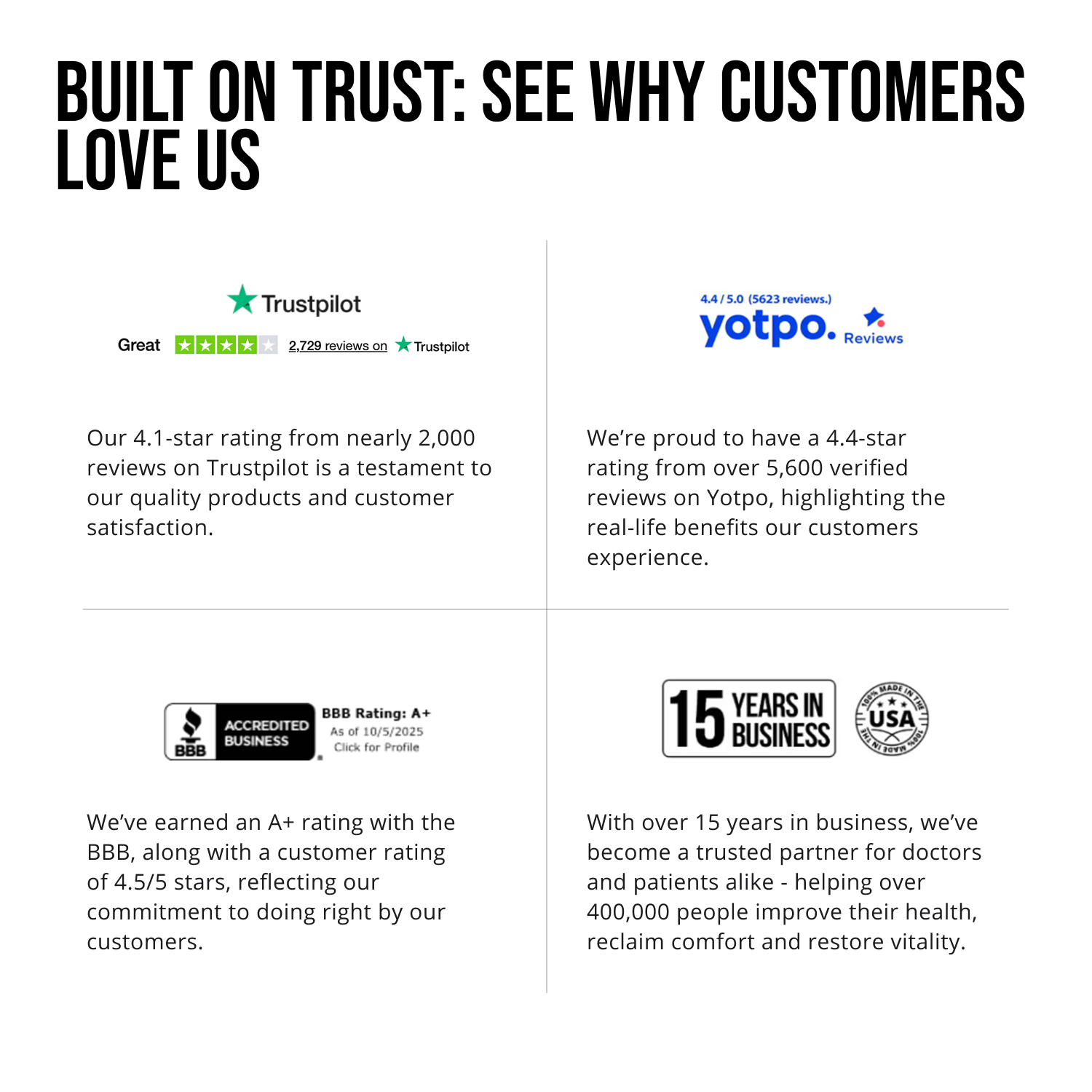 With over 15 years in business, we’ve become a trusted partner for doctors and patients alike - helping over 400,000 people improve their health, reclaim comfort and restore vitality.