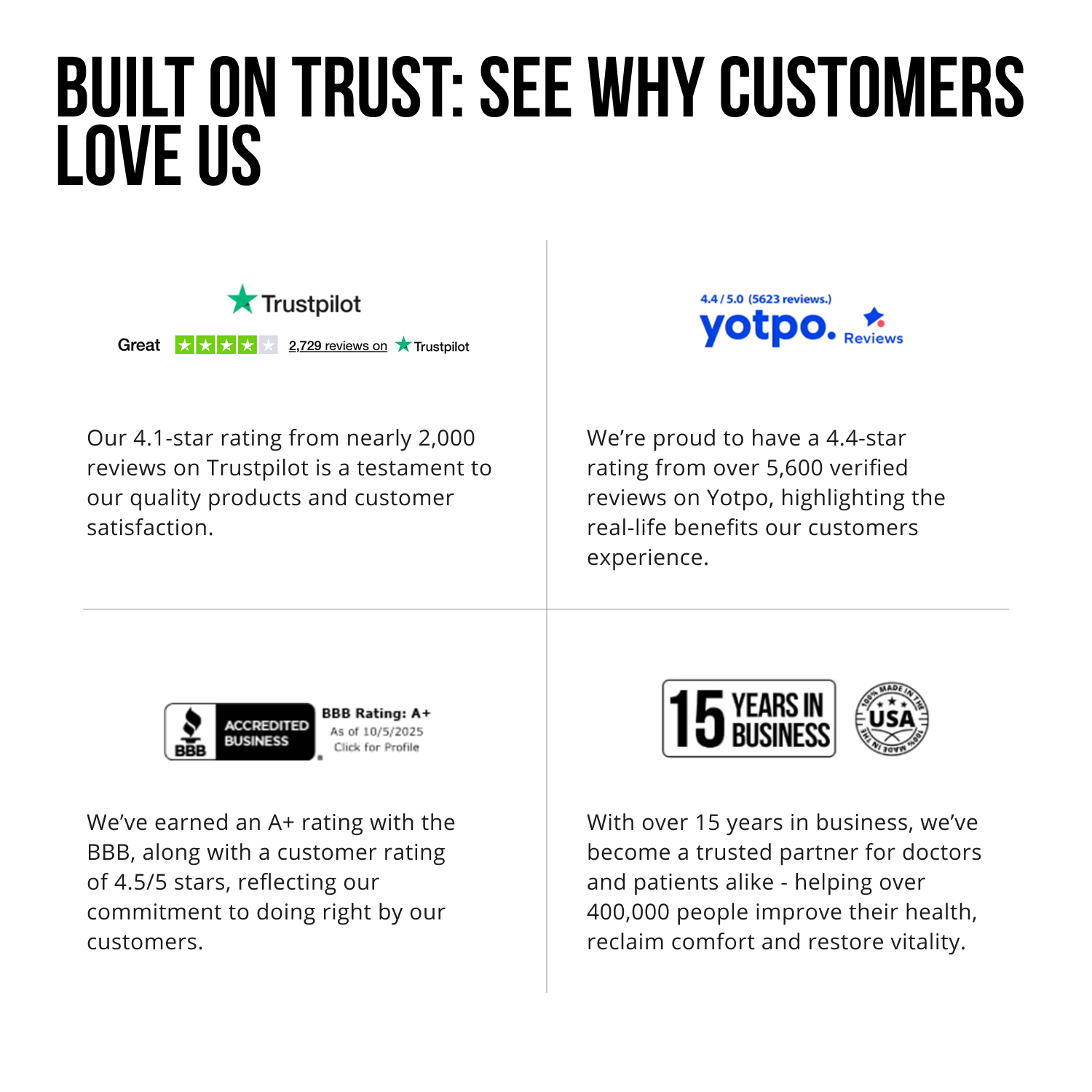 With over 15 years in business, we’ve become a trusted partner for doctors and patients alike - helping over 400,000 people improve their health, reclaim comfort and restore vitality.