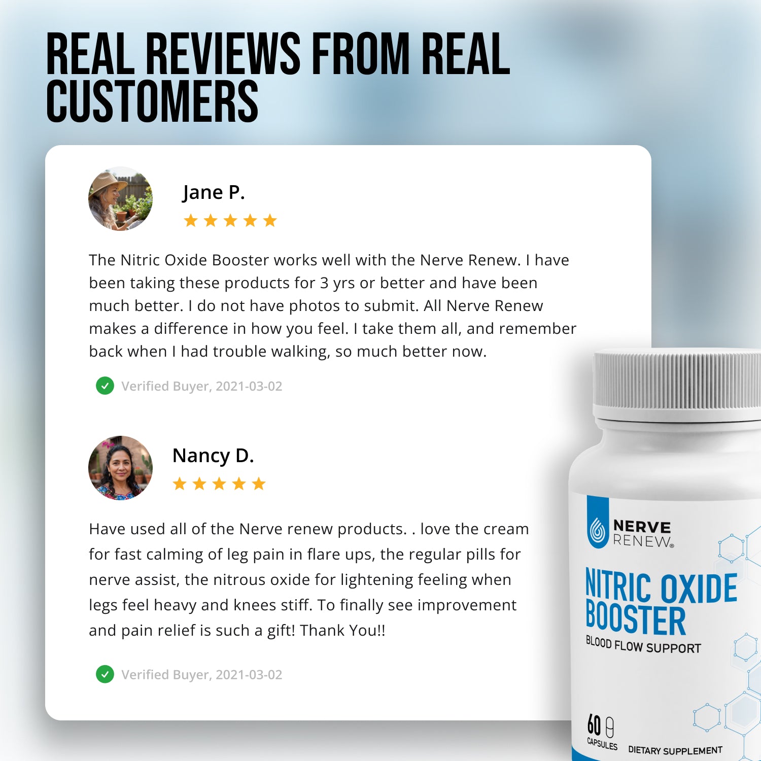 For best results, we recommend taking Nitric Oxide Booster along with Nerve Renew to help more of its nerve-boosting vitamins and nutrients reach all parts of the body.